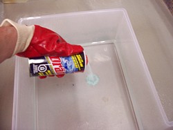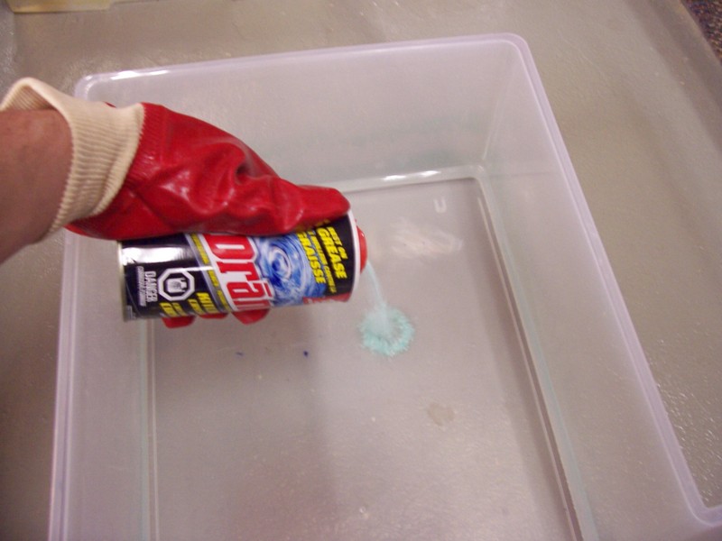 Keep your gloves and splash goggles on and pour some Drano into some cool water. Mix the solution well.