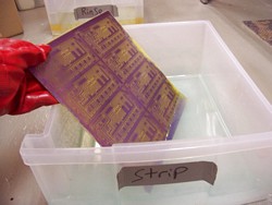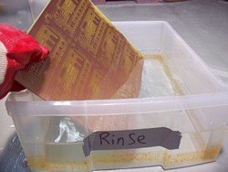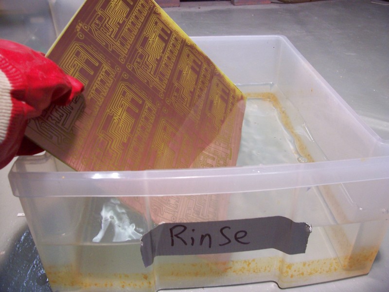 Remove the board from the rinse water and hold it up to the light to inspect the results.
