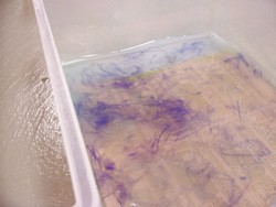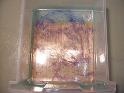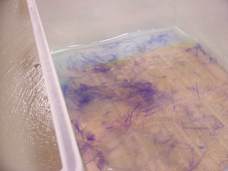 You should start to see the resist detaching from the copper. Gently rock the container if desired.