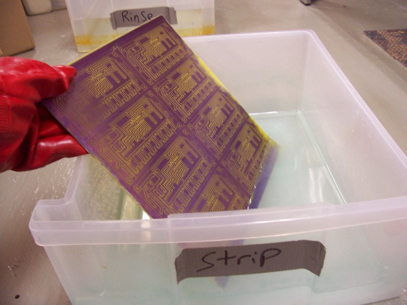Drop the circuit board into the solution to strip the coating (resist) from the board.
