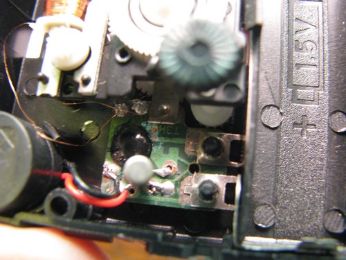 Initially the plan was to solder the wire to the positive battery connection and the trace that was exposed earlier. That worked fine for about 5 minutes but before I could employ some hot glue strain relief the tiny trace pulled off the board. The only option was to solder the wire to the copper under the alarm contact. Problem with that is that this would physically interfere with the mechanical alarm On/Off switch. The solution was to rip out the On/Off alarm switch. 🙂