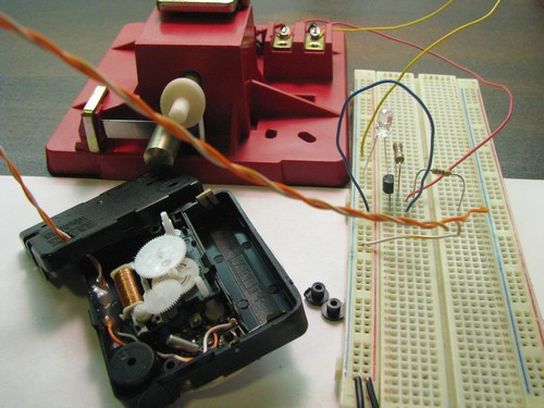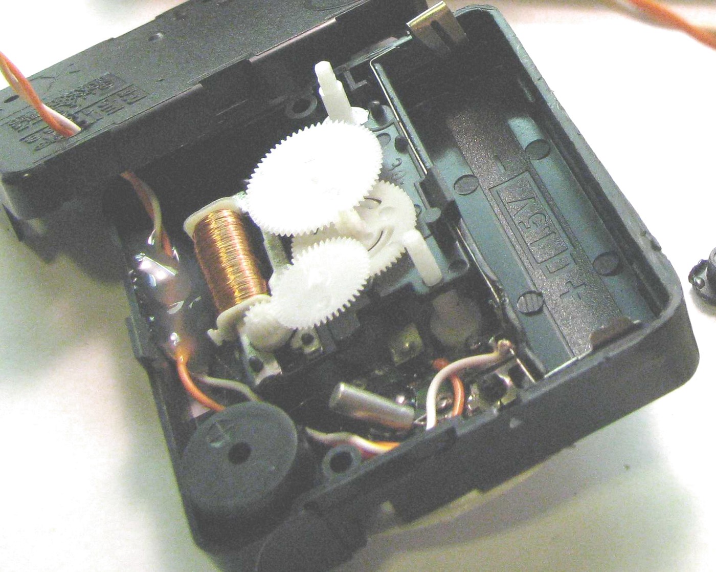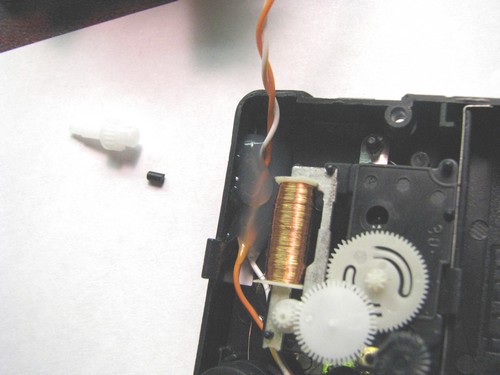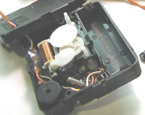 For strain relief some hot glue was used to keep the wire from moving. Have a look at the left of the clock assemble, that is one of the adjustment knobs and the black thing is the plastic guide that normally keeps it in place. Everything is so small and delicate… Some crazy glue solved the minor setback.